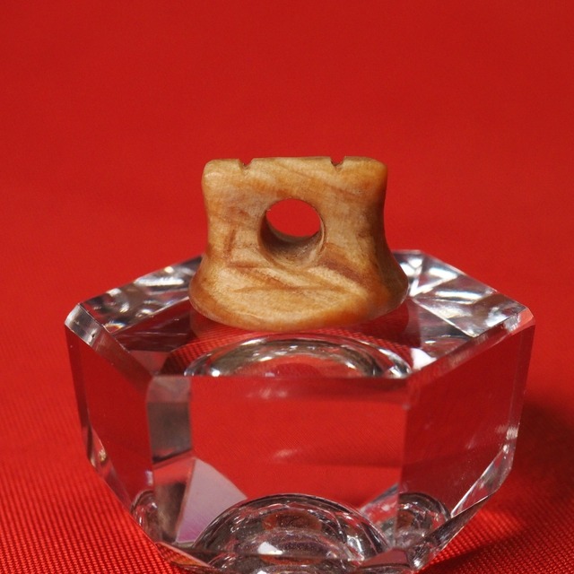 二胡駒 馬蹄駒(なめら松根株)302 ・駒の高さ :8.5mm ・底面の形状:馬蹄形 ・底面の直径:約15mm ・ノイズが出にくく、厚みのあるまろやかな音が特徴。 ・底面の馬蹄形状により、よく響く。 ※装着方向があります(画像参照)。 ※本材料は残りわずかのため、イベント時等の不定期生産となります。 【馬蹄駒】 弦→駒→蛇皮への振動伝達効率を上げるために、馬の蹄をヒントに底面加工を施した駒。中空の馬蹄型接地形状では、接地面の圧力が大きくなること、接地面積が蛇皮の張りの強さ・硬さ(つまり、蛇皮表面の平面性)に影響されず密着すること、損失するコントロールマット側の振動を、他方面に使うことにより、響き、音量ともに良くなります。 【なめら松】 皇居新宮殿にも使用されたことで有名な、山口県産の樹齢200年を超える赤松を指し、この駒の製作には数十年前に伐採された根株を使用。脂が結晶化しており、磨くと鼈甲か琥珀のような透明感が顕在化し、2cm厚の材でも光を透し、 材自体が紅色を呈する。 高崎駒のフラッグシップ「伊後肥松-御神木黒松」に比較的似た音色であるが、比重はなめら松根株材の方がやや小さく、より柔らかい音を奏でる。結晶化した松脂を含む老松節など類似材は、もともと中国でも二胡駒として最適として珍重される。