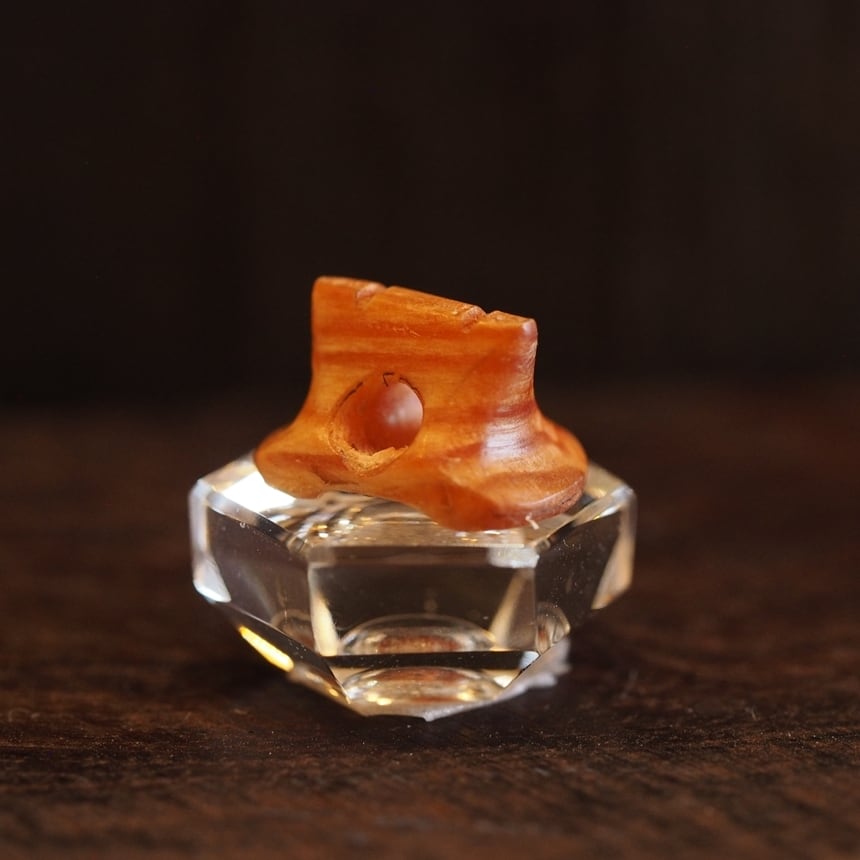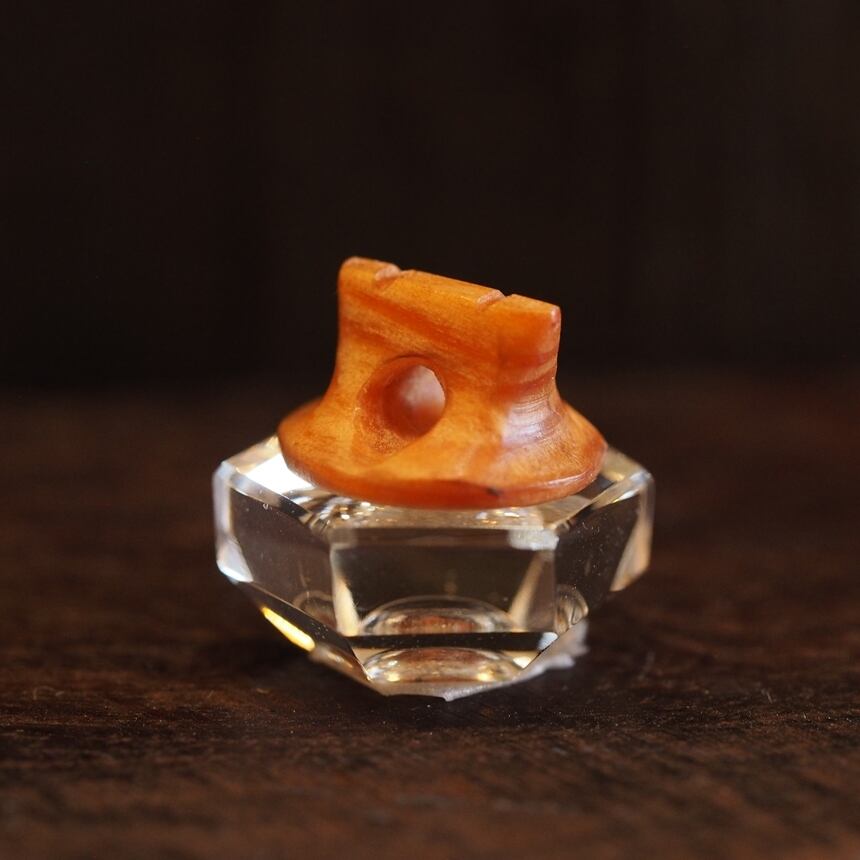 弦→駒→蛇皮への振動伝達効率を上げるために、馬の蹄をヒントに底面加工を施した駒。中空の馬蹄型接地形状では、接地面の圧力が大きくなること、接地面積が蛇皮の張りの強さ・硬さ(つまり、蛇皮表面の平面性)に影響されず密着すること、損失するコントロールマット側の振動を、他方面に使うことにより、響き、音量ともに良くなります。