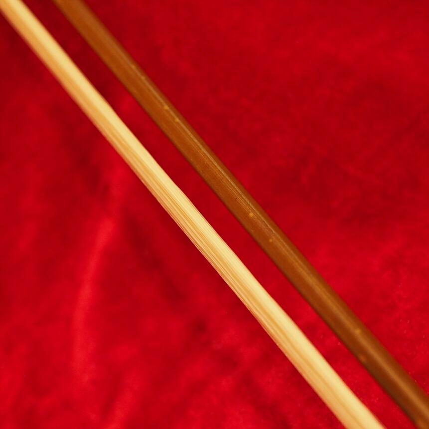 弓の先端から手元までの間に節が1つあります。下位の精品クラスは、弓の先端から50-60cmの位置に節があるのに対し、この臻品クラスは65cm以上の位置に節がある竹を選び、節がない弾力が良好な部分が、弓棹の大部分を占めるように材料選定されています。