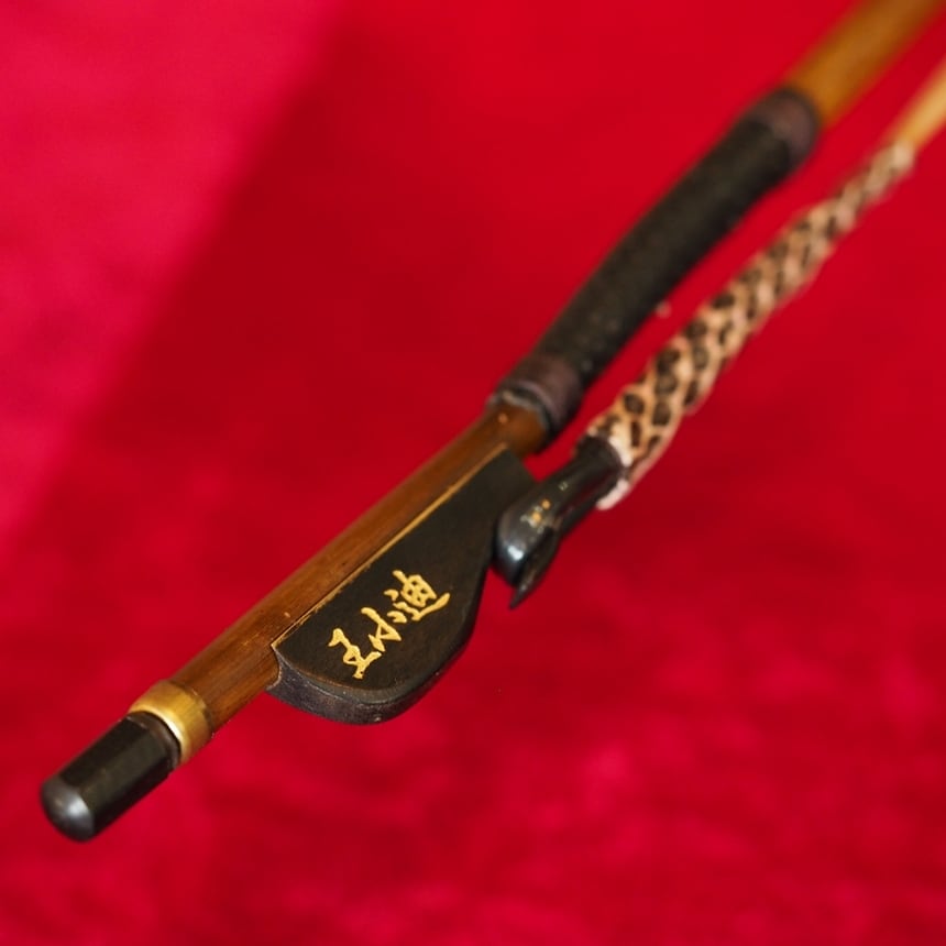 弓竹には、節の位置が後方にあり弓全体の靭性とバランスがとれた厳選紅竹を採用。弓毛には、最上位の尊品クラスに近い、厳選された無漂白の白馬雄尾を使用。