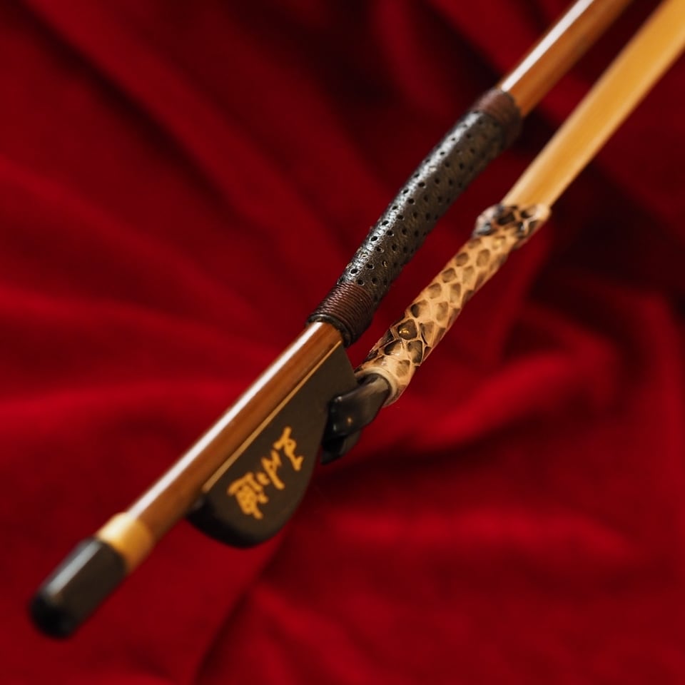 弓竹には、節の位置が後方にあり弓全体の靭性とバランスがとれた厳選紅竹を採用。弓毛には、最上位の尊品クラスに近い、厳選された無漂白の白馬雄尾を使用。