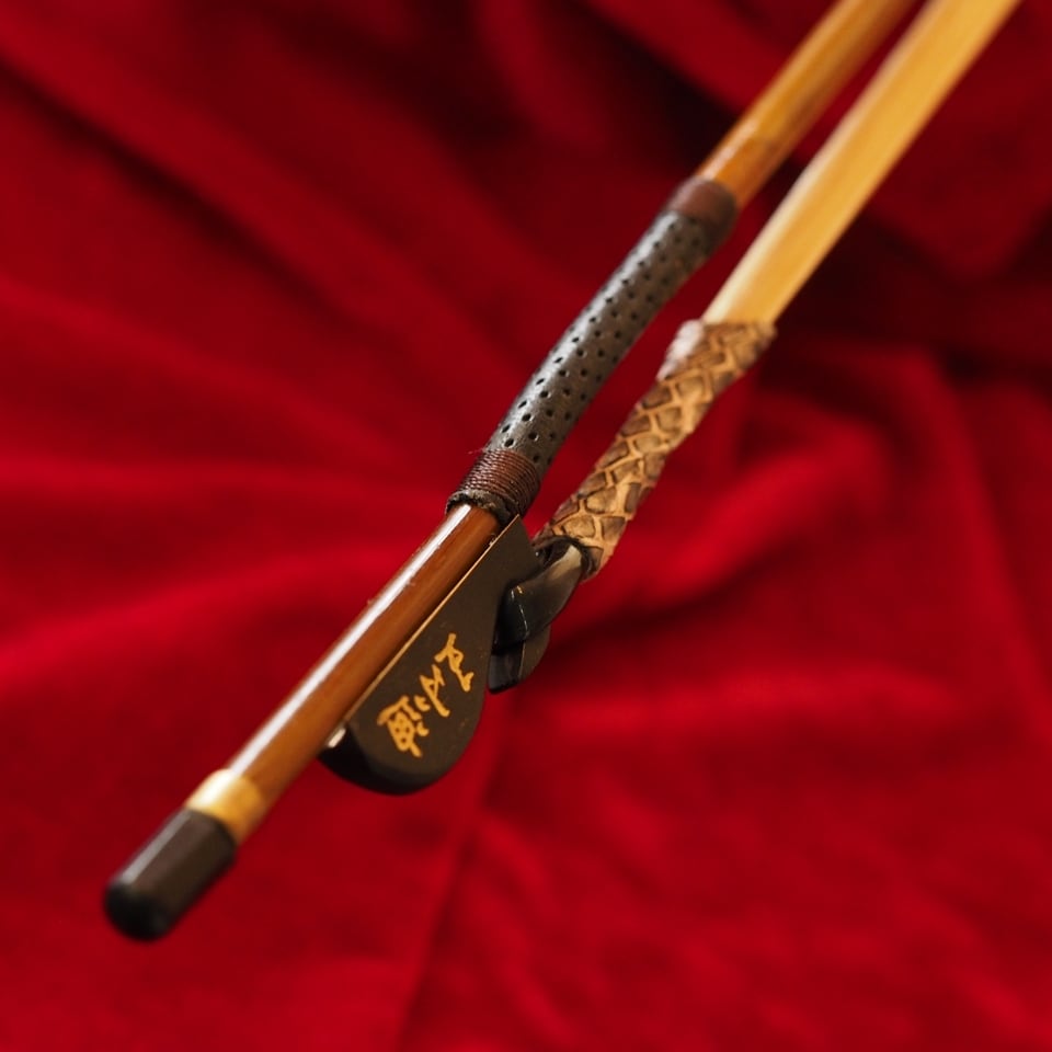 弓竹には、節の位置が後方にあり弓全体の靭性とバランスがとれた厳選紅竹を採用。弓毛には、最上位の尊品クラスに近い、厳選された無漂白の白馬雄尾を使用。