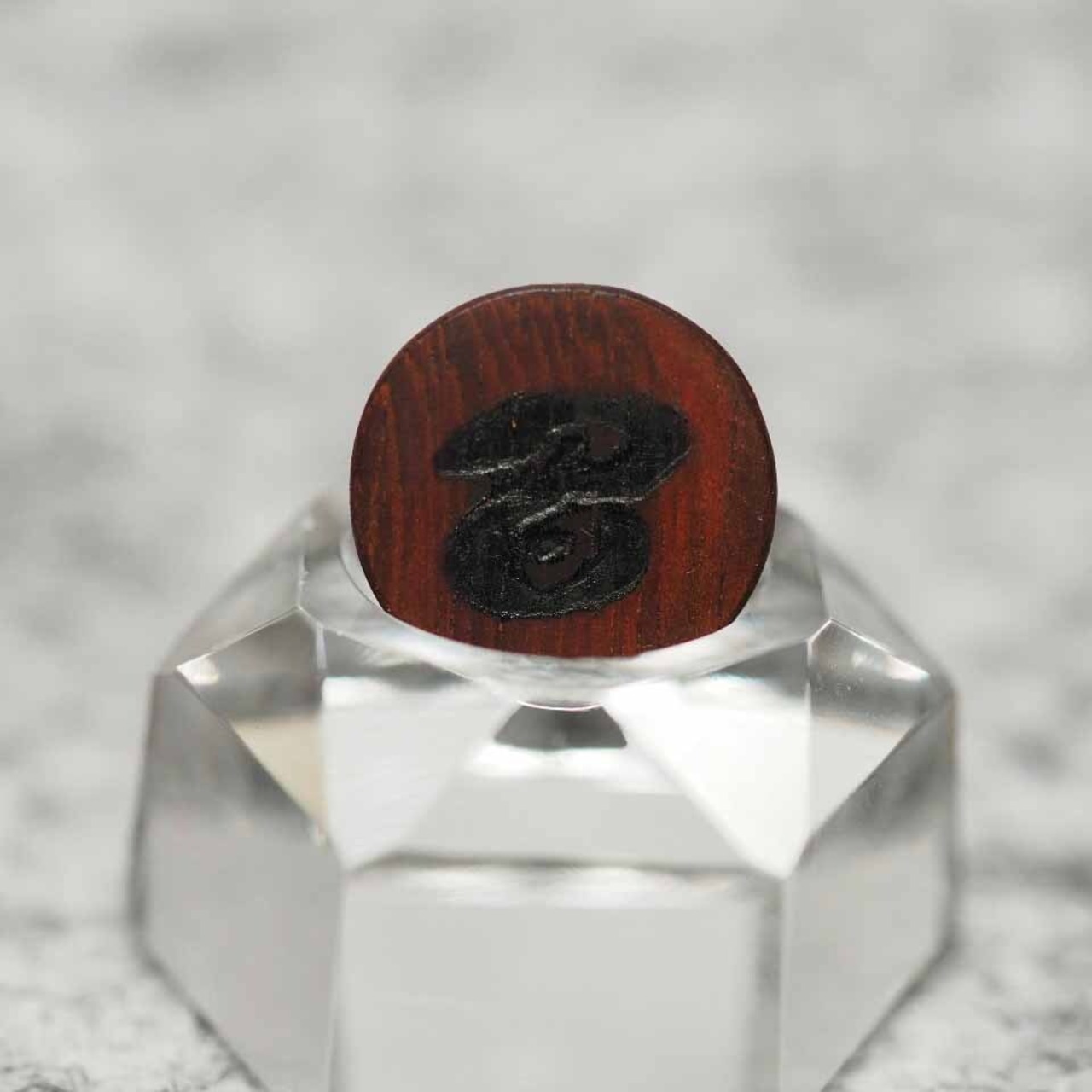 ※画像は、駒製作時のもので赤みを帯びた部分がありますが、紫檀は空気接触による酸化により、時間の経過とともに全体が暗紫色へと変化していきます。