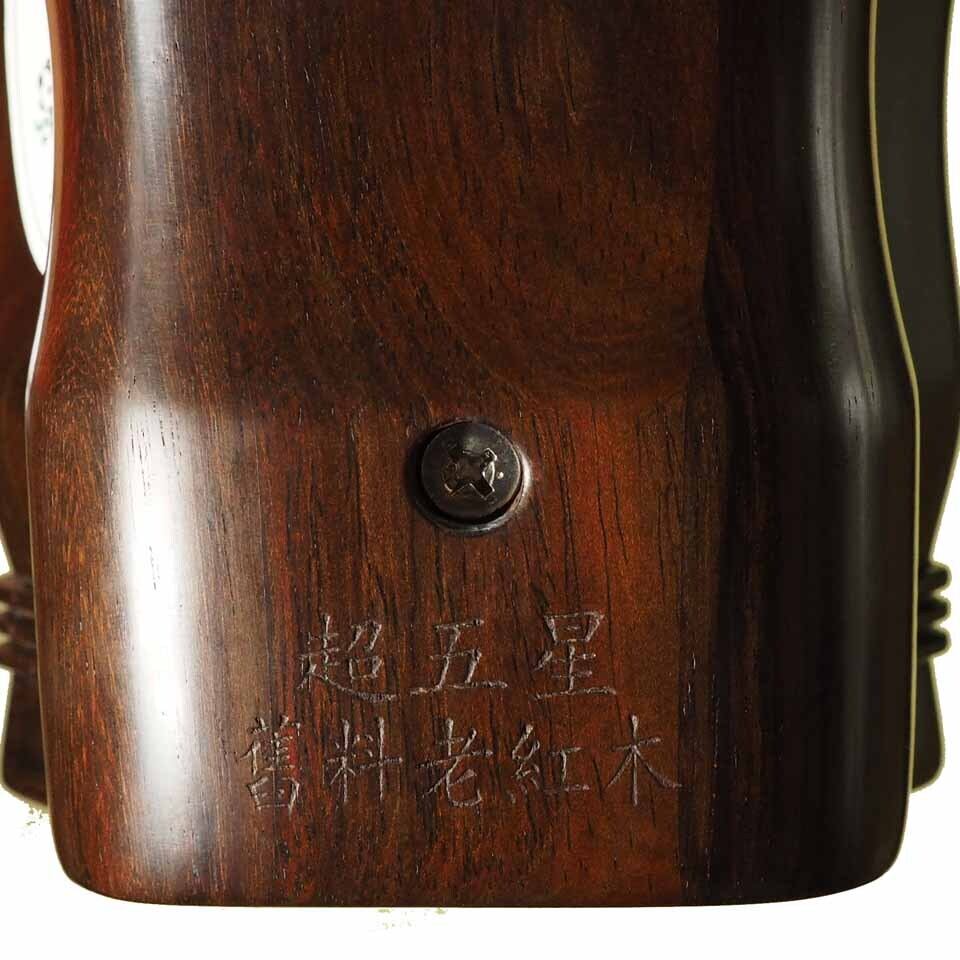 明清同時代におけるベトナム・ミャンマーの建築廃材、古い家具を材料として使用しています。永い年月を経ているため、水分はほとんど含まれず、たたくと特有の金属音がします。数多くの二胡愛好家やコレクターに愛されています。超五星の材料は、五星ランクよりさらに古く良質で貴重な材であり、限定生産です。