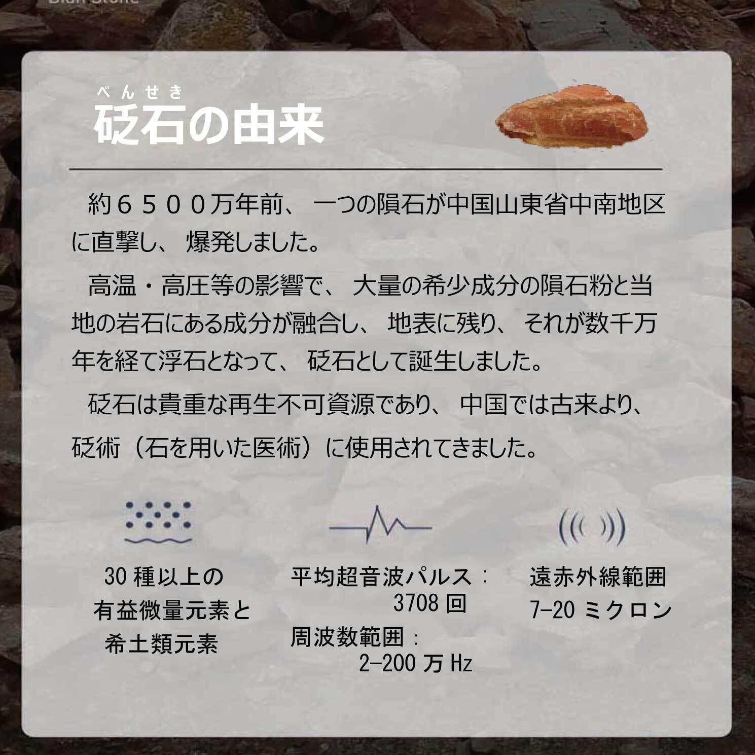 こちらのカッサプレートには、希少で貴重な赤色のべん石を使用しております。べん石は再生不可資源であり、中国では古来より、針、灸、按摩に並ぶ「べん術」に使用されてきました。