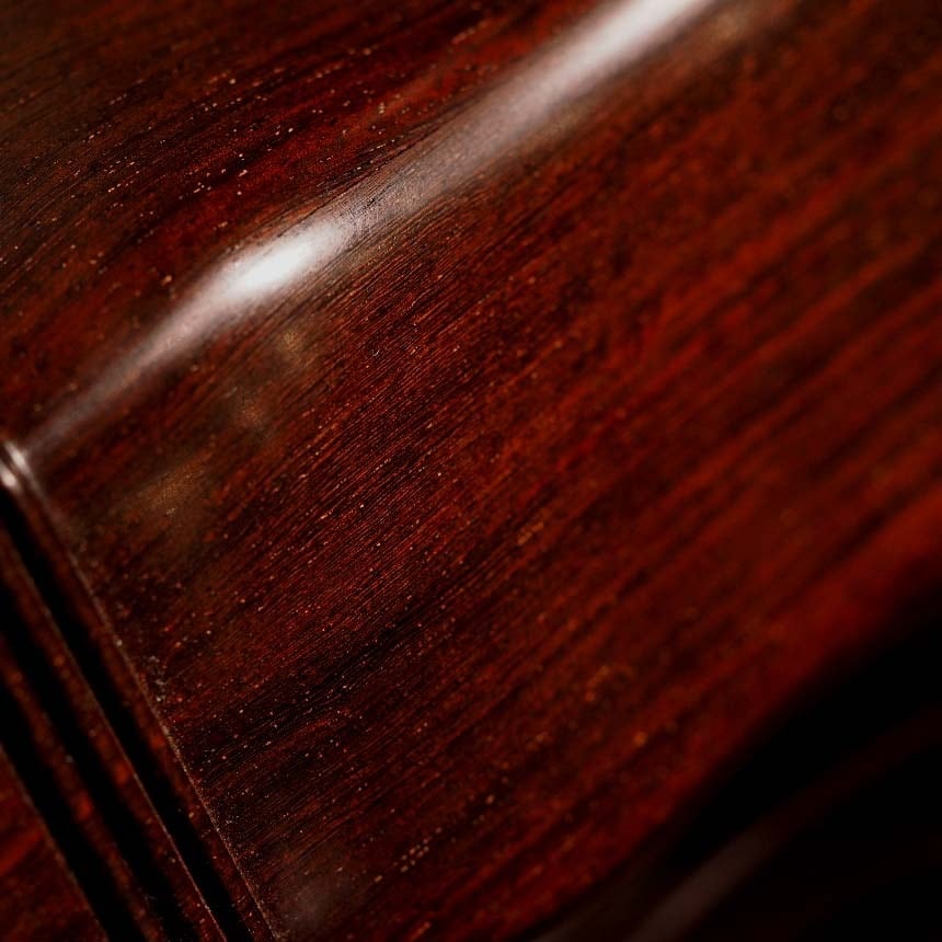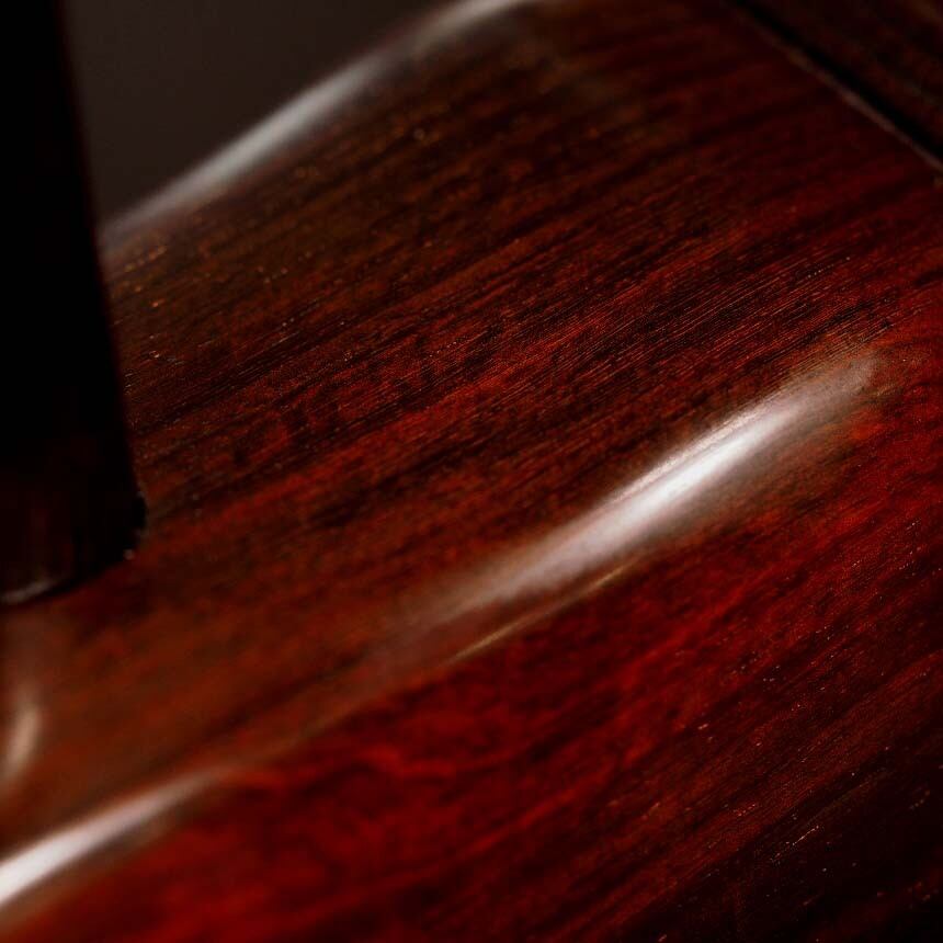 インド小葉紫檀は伐採が禁止されているため、製作に使用した材料は家具材などとても古いものになり、色が酸化により暗赤色となっております。
