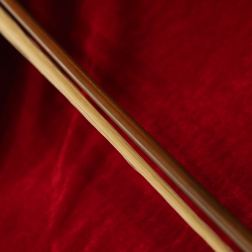 弓の先端から手元までの間に節が1つあります。下位の精品クラスは、弓の先端から50-60cmの位置に節があるのに対し、この臻品クラスは65cm以上の位置に節がある竹を選び、節がない弾力が良好な部分が、弓棹の大部分を占めるように材料選定されています。雄の馬毛を張り、滑り防止のために持ち手部分に巻革(蛇革)が施されています。