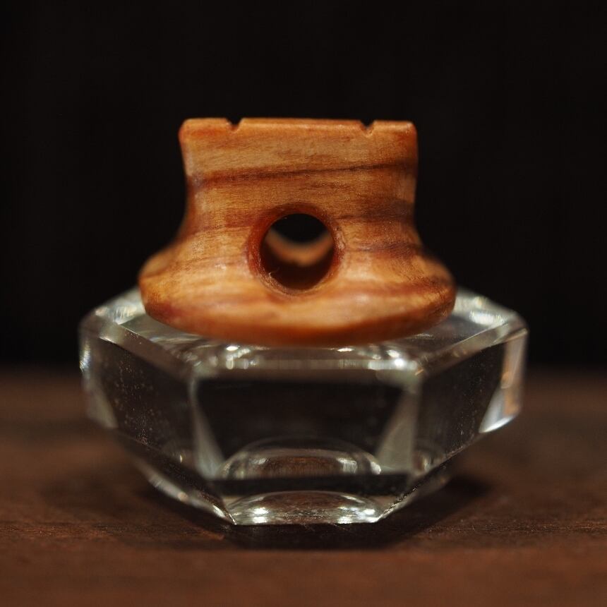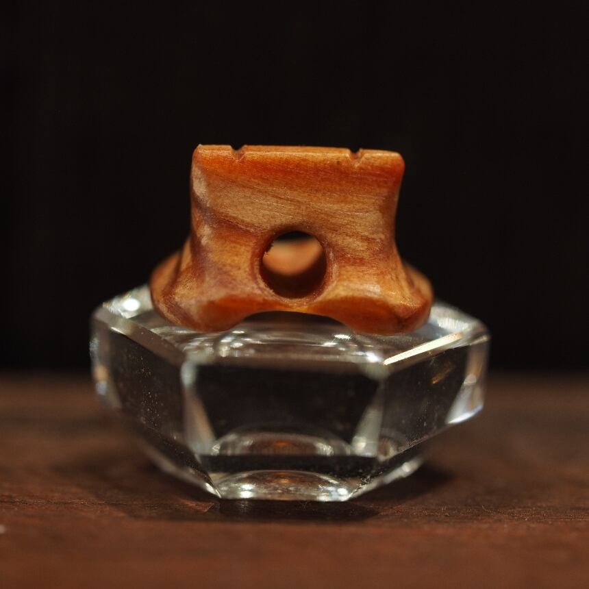 弦→駒→蛇皮への振動伝達効率を上げるために、馬の蹄をヒントに底面加工を施した駒。中空の馬蹄型接地形状では、接地面の圧力が大きくなること、接地面積が蛇皮の張りの強さ・硬さ(つまり、蛇皮表面の平面性)に影響されず密着すること、損失するコントロールマット側の振動を、他方面に使うことにより、響き、音量ともに良くなります。