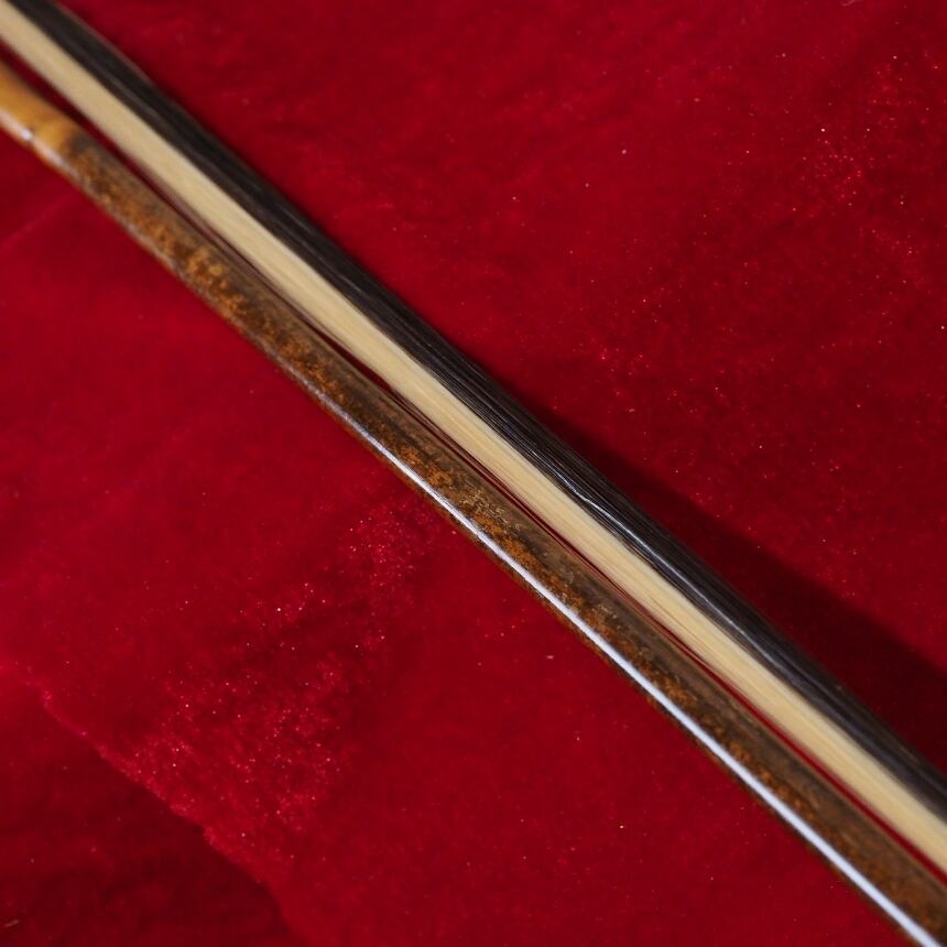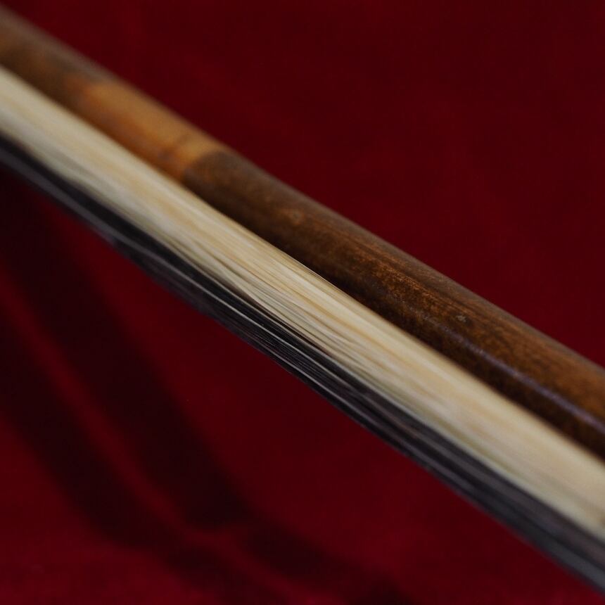 弓毛には、つややかな音色を保持するための無漂白白馬雄毛、強い摩擦を生み出すための花毛(黒毛、褐色毛)をミックスしたものを使用。