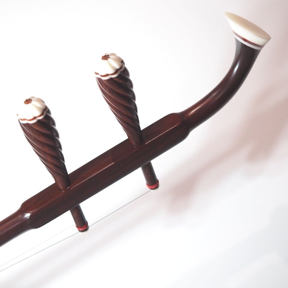 特徴:紫檀の抜けのよい音色を潜在的に持ちつつ、厚く柔らかい音色が特徴。明清老紅木と同様、演奏者の繊細な表現を受け止め音にする性能は特筆もの。特に、ハイポジションで使える音域が広く、高難易度の独奏曲にあう。多くの二胡愛好家に人気である。